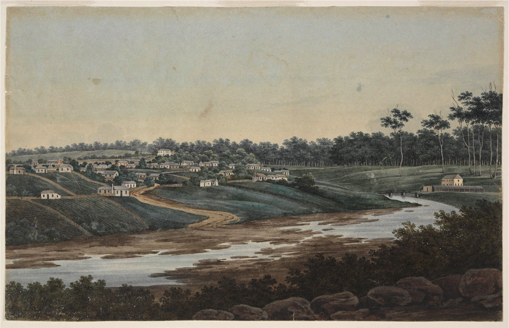 CLICK IMAGE TO ENLARGE. An early incarnation of Parramatta Gaol is depicted to the right, at the end of the “Old Gaol Bridge” across the Parramatta River, a bridge that was later partially incorporated into the Lennox Bridge. At the time, the first Parramatta Female Factory, known as “The Factory Above the Gaol,” was also part of the same complex. “A View of Part of Parramatta Port Jackson,” c.1809, attributed to George William Evans. Series 01: Australian paintings by J.W. Lewin, G. P. Harris, G. W. Evans and others, 1796–1809 [32 watercolours], Vol. 3, PXD 388 / FL1152086, Mitchell Library, State Library of New South Wales.