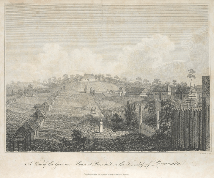 CLICK IMAGE TO ENLARGE. James Heath, A View of the Governor’s House at Rose Hill in the township of Parramatta, (Strand, [London]: Published by Cadell & Davies, 25 May 1798), PIC Volume 26 #S11111/2, nla.obj-281608985. Courtesy of National Library of Australia via Trove.