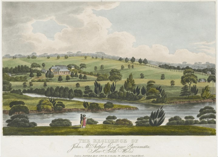 CLICK IMAGE TO ENLARGE. Joseph Lycett, The Residence of John Mcarthur Esqre. Near Parramatta. New South Wales, (73 St. Paul’s Church Yard, London: J. Souter, 1 April 1825). Courtesy of State Library Victoria.
