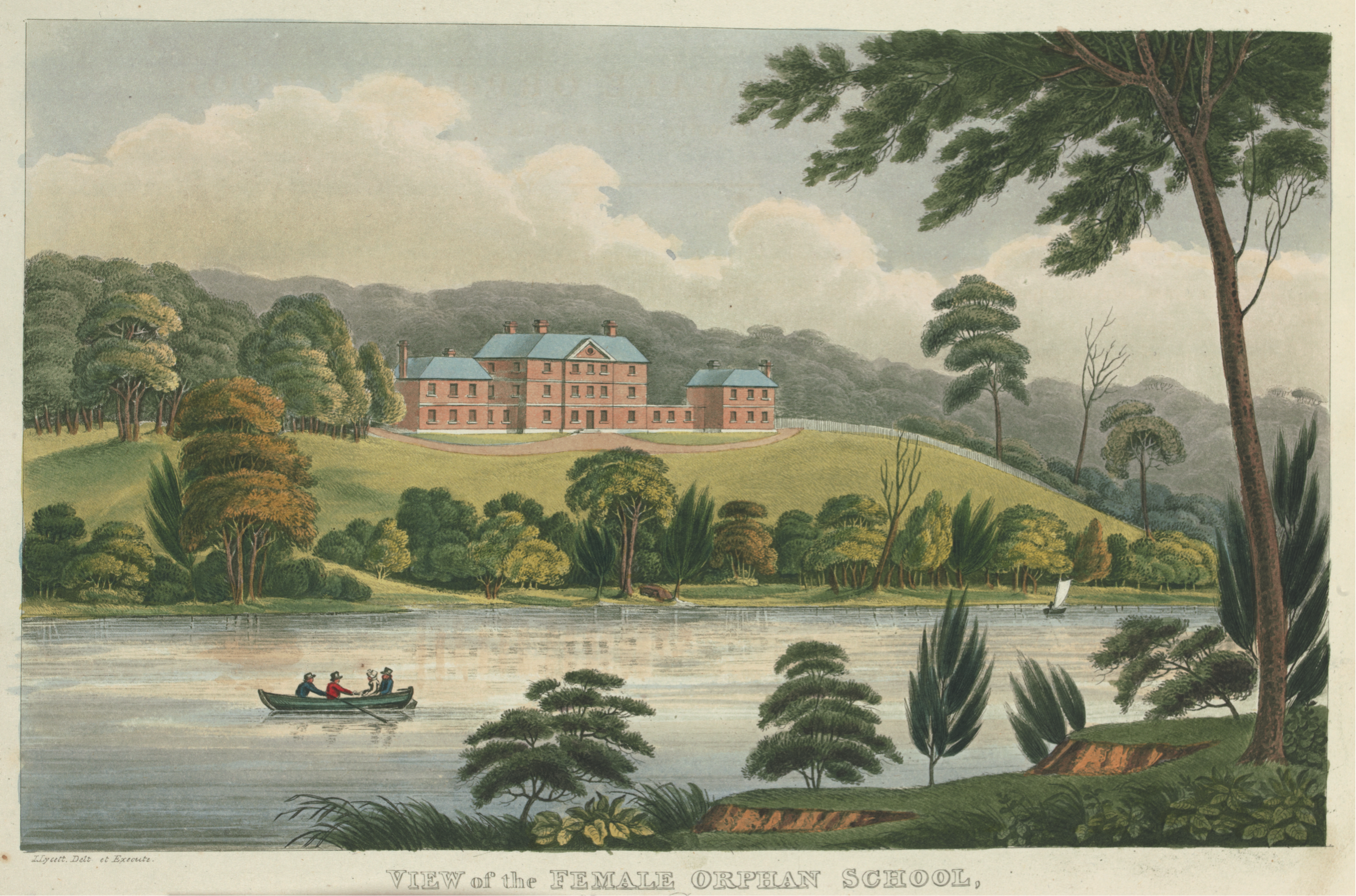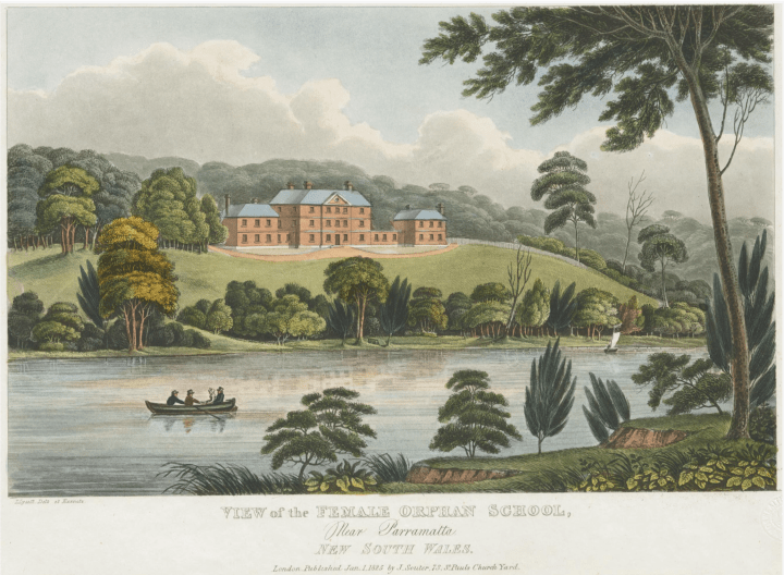 CLICK IMAGE TO ENLARGE. Joseph Lycett, View of the Female Orphan School, Near Parramatta, New South Wales, (73 St. Paul’s Church Yard, London: J. Souter, 1 January 1825), State Library of Victoria.