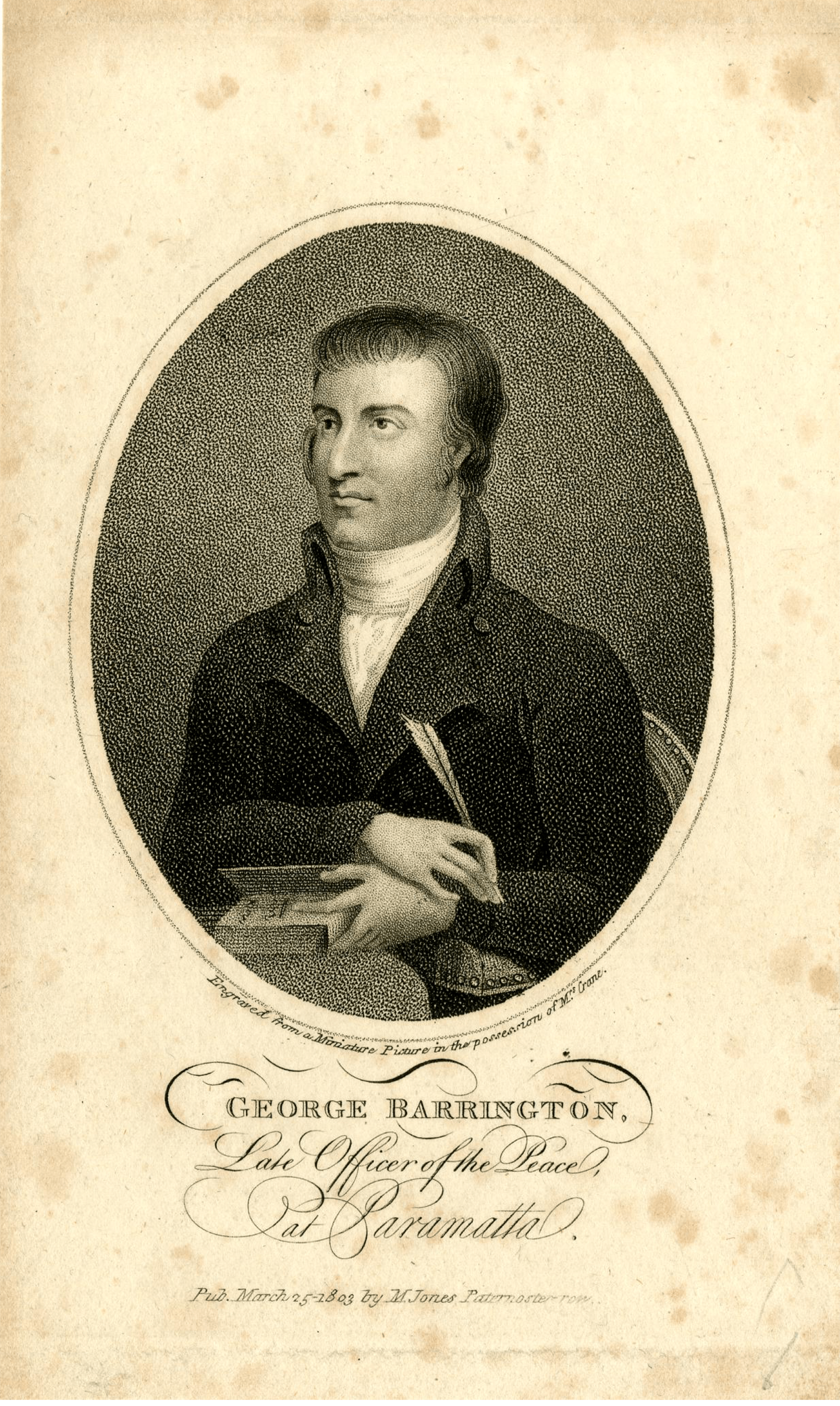 George Barrington, Late Officer of the Peace, at Paramatta [Parramatta], Engraved from a Miniature Picture in the possession of Mrs. Crane (1803) CLICK IMAGE TO ENLARGE. George Barrington, Late Officer of the Peace, at Paramatta [sic], Engraved from a Miniature Picture in the possession of Mrs. Crane, (Paternoster-row, London: M. Jones, 25 March 1803), (CC BY-NC-SA 4.0), © The Trustees of the British Museum. Related Material Michaela Ann Cameron, “George Barrington: The Prince of Pickpockets,” St. John’s Online, (2021).