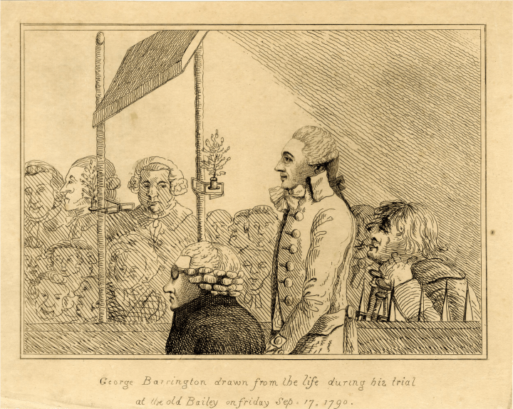 George Barrington drawn from the life during his trial at the Old Bailey on Friday Sep 17 1790, by unknown artist (1790) CLICK IMAGE TO ENLARGE. George Barrington drawn from the life during his trial at the Old Bailey on Friday Sep. 17, 1790, by unknown artist, (1790), (CC BY-NC-SA 4.0), © The Trustees of the British Museum. Related Material Michaela Ann Cameron, “George Barrington: The Prince of Pickpockets,” St. John’s Online, (2021).