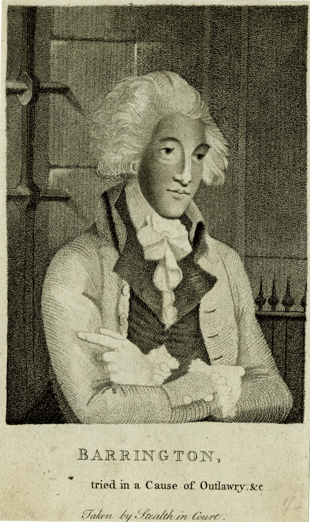 George Barrington, tried in a Cause of Outlawry &c, Taken by Stealth in Court, unknown artist, (c.1780–1790) CLICK IMAGE TO ENLARGE. Barrington, tried in a Cause of Outlawry &c, Taken by Stealth in Court, by unknown artist, (c.1780–1790), (CC BY-NC-SA 4.0), © The Trustees of the British Museum. Related Material Michaela Ann Cameron, “George Barrington: The Prince of Pickpockets,” St. John’s Online, (2021).