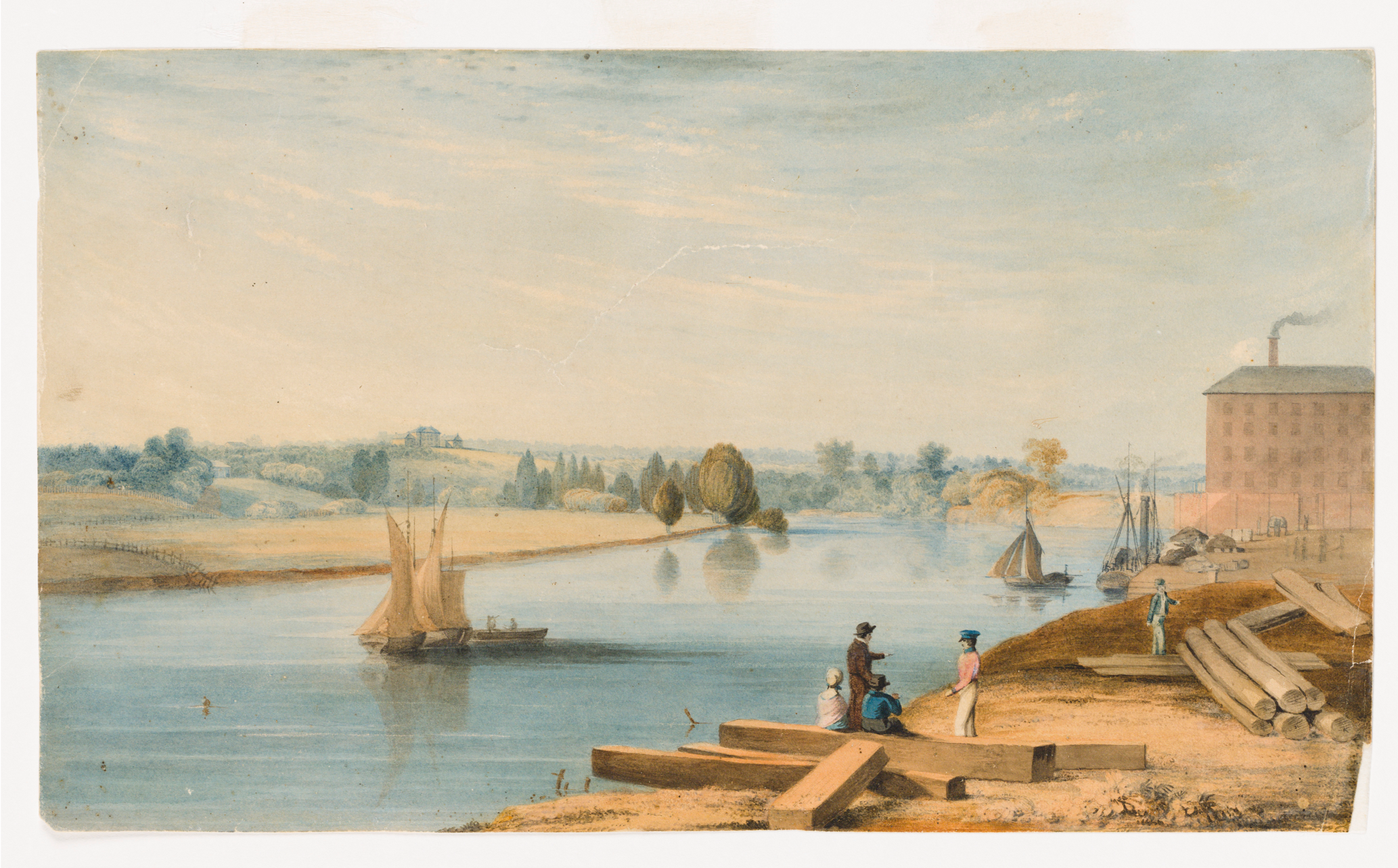 CLICK IMAGE TO ENLARGE. Parramatta, [c. 1847+]. Watercolour. Unsigned. Dated from date of construction of Byrne’s Cloth Mill shown at right. In Sketches of New South Wales, Tasmania and Victoria, by Lempriere and others, ca. 1830–1869, DL PXX 39 / FL4452211, Dixson Library, State Library of New South Wales.