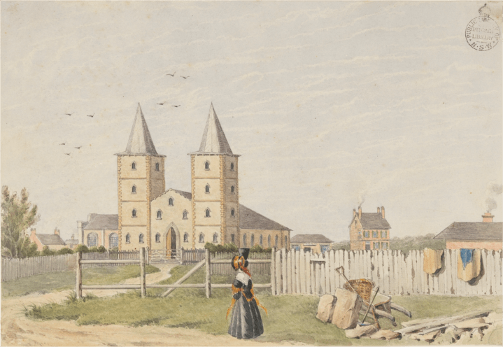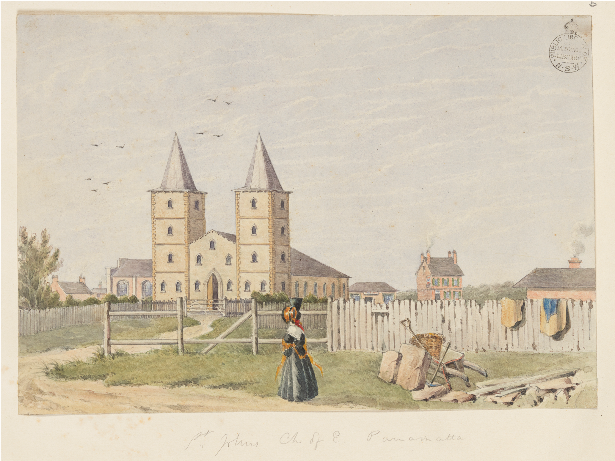 CLICK IMAGE TO ENLARGE. “St. Johns Ch of E. [Church of England], Parramatta,” by unknown artist, previously attributed to Joseph Fowles, in Drawings in Sydney, (c.1840–1850), PX*D 123 / FL3170481, Mitchell Library, State Library of New South Wales.